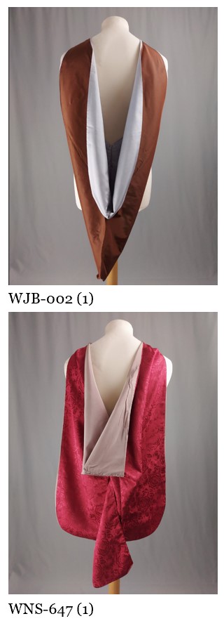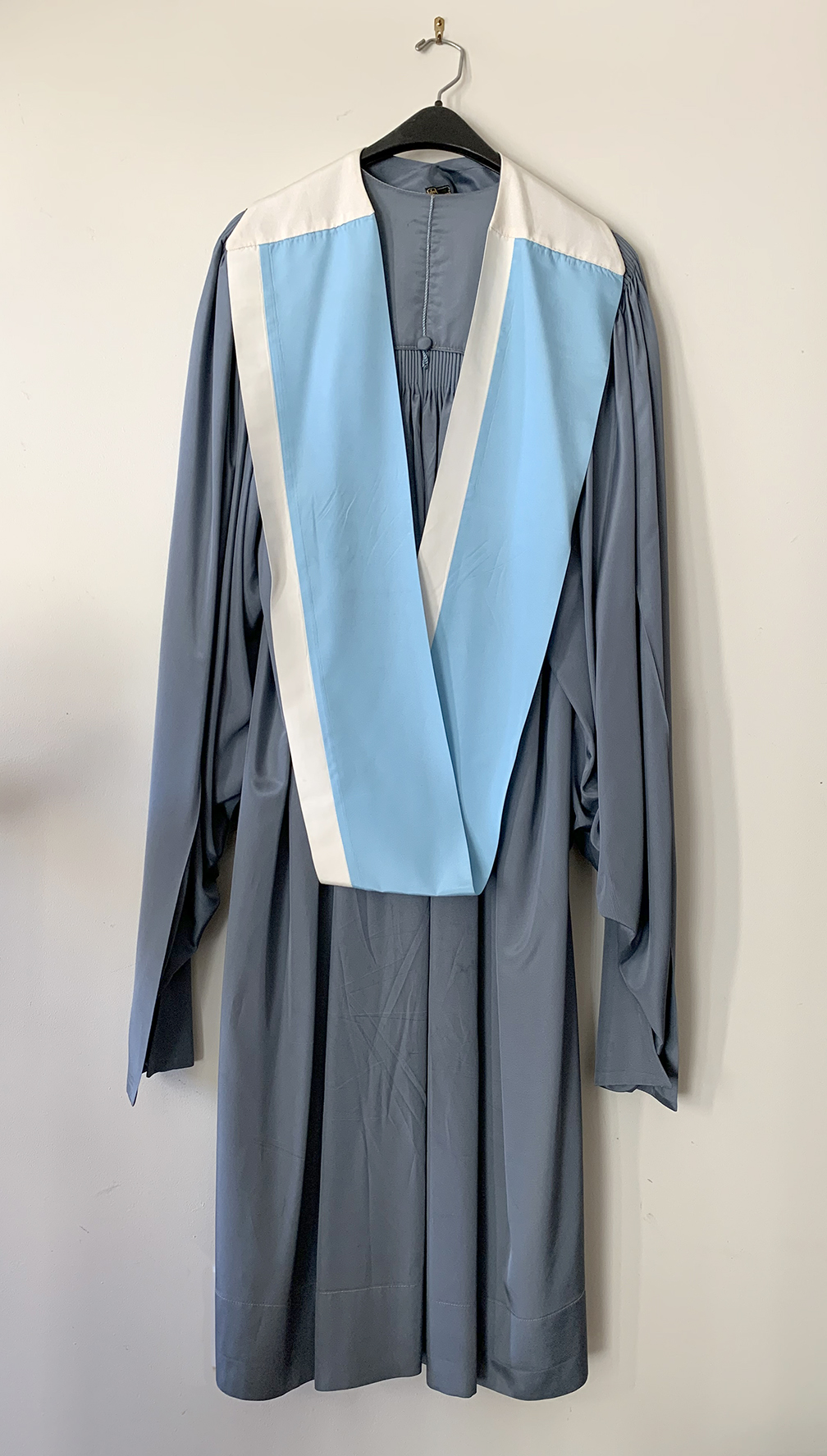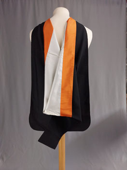 The robemaker Bentley & Simon called it an ‘oblong hood’, but it cannot function as a hood and instead resembles a light scarf that has had its ends sewn together, forming a circle. It has no lining, liripipe or cowl, nor the white chevron that is appears on other Columbia hoods. Its only apparent connection to traditional American academic dress is the binding and the portion in front of the neck (visible at the shoulders) in the faculty colour. White represents Arts & Letters.