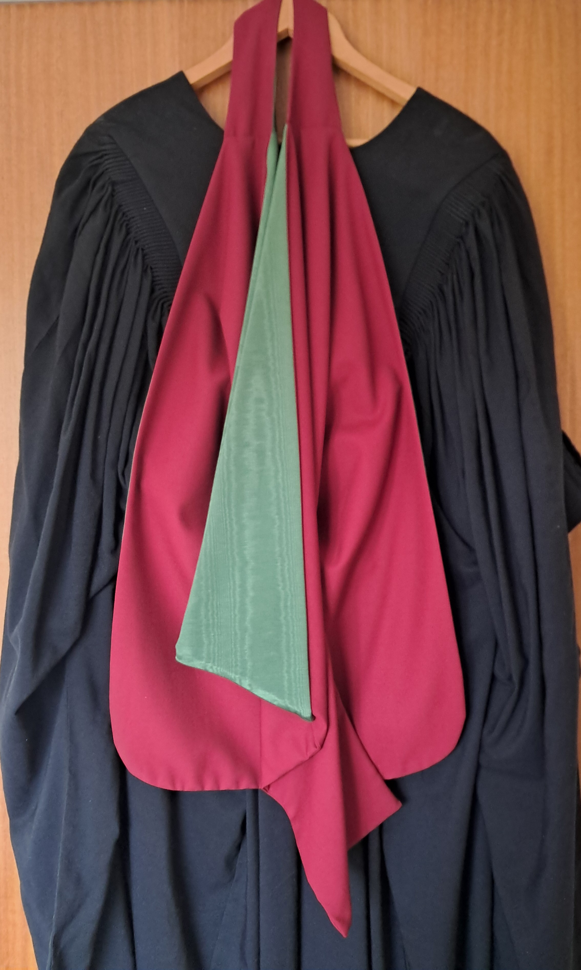 The PhD gown is of a standard master's pattern, with a double crescent cut in the sleeve boot, in black silk or stuff, with red/green shot taffeta facings. The hood is CNAA [a1] shape, in maroon cloth, lined and bound 2" with red/green shot taffeta. These are worn with a black cloth Tudor bonnet with red and green twisted cord and tassels.