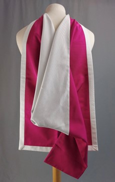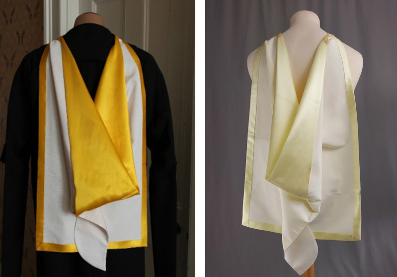 It is similar to the visiting professors’ hood for University of the Arts London (formerly the London Institute), designed by Ede & Ravenscroft in 1996, which is bound with white silk around the cape only.