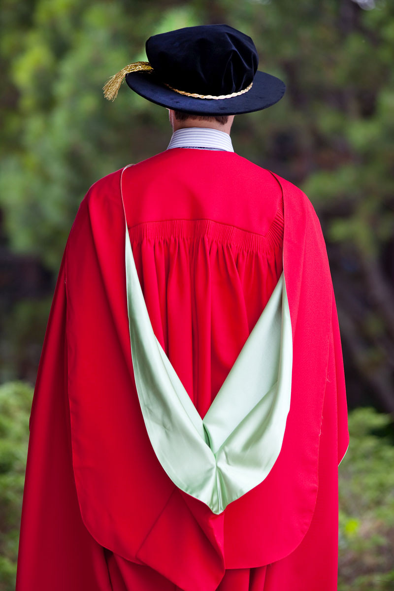 However, the system was adapted from 2000, so that the only use of the colours at doctoral level would be to line the scarlet hoods of higher doctors. All PhDs were henceforth allotted the same hood, lined with bottle-green watered silk, with which the robe is also faced. This standardisation produced a pleasing and somewhat Regency combination, lessened the confusion between hoods of the same academic level, and aligned the University with the schemes of several others, including Exeter, Manchester and Warwick.