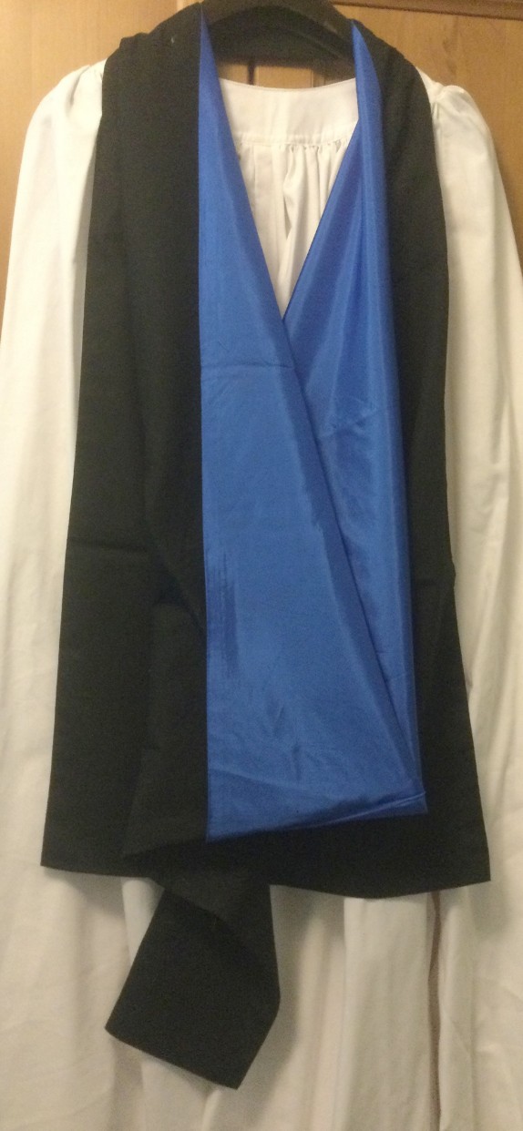 This hood will also do duty as a Cambridge MPhil, as the lining is the correct shade. Specified simply as “blue” in Ordinance II.12, the MPhil lining is variously described as “royal blue” (Ryder and Amies website, Shaw 3) and “dark blue” (Shaw’s Cambridge pamphlet, Groves TBS 13). It is in practice the shade previously used by the BEd, with the MEd receiving the “light blue” originally intended for the MPhil. Recent MPhil hoods from Ede and Ravenscroft are being lined with an Oxford blue, which is much too dark.