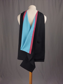 This hood is a Master of Science from the Victoria University of Wellington in New Zealand: Cambridge full [f1] shape, black cloth outer, lined with empire blue silk (British Colour Council (BCC) colour standard number 87). This hood is also used for the MSc degree at Auckland. Empire Blue replaced the original science lining of “dark blue” (actually BCC Ultramarine 148) at Victoria in 1969. The old hood with the ultramarine lining was inherited from the University of New Zealand, which used it from the instigation of science degrees in 1891 until the federal university was dissolved in 1961.